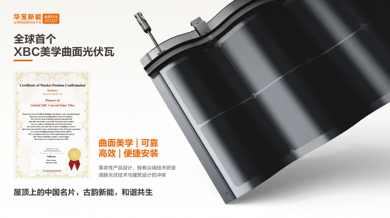 华宝新能美学曲面光伏瓦创新性融入东方建筑美学元素,集成了行业领先的XBC技术和独创的晶硅多曲封装技术,150°多曲设计可灵活适配不同屋顶坡度,不仅保留了传统建筑的韵味质感,其XBC电池还实现了高达25%的转换效率,真正做到“秀外慧中”。